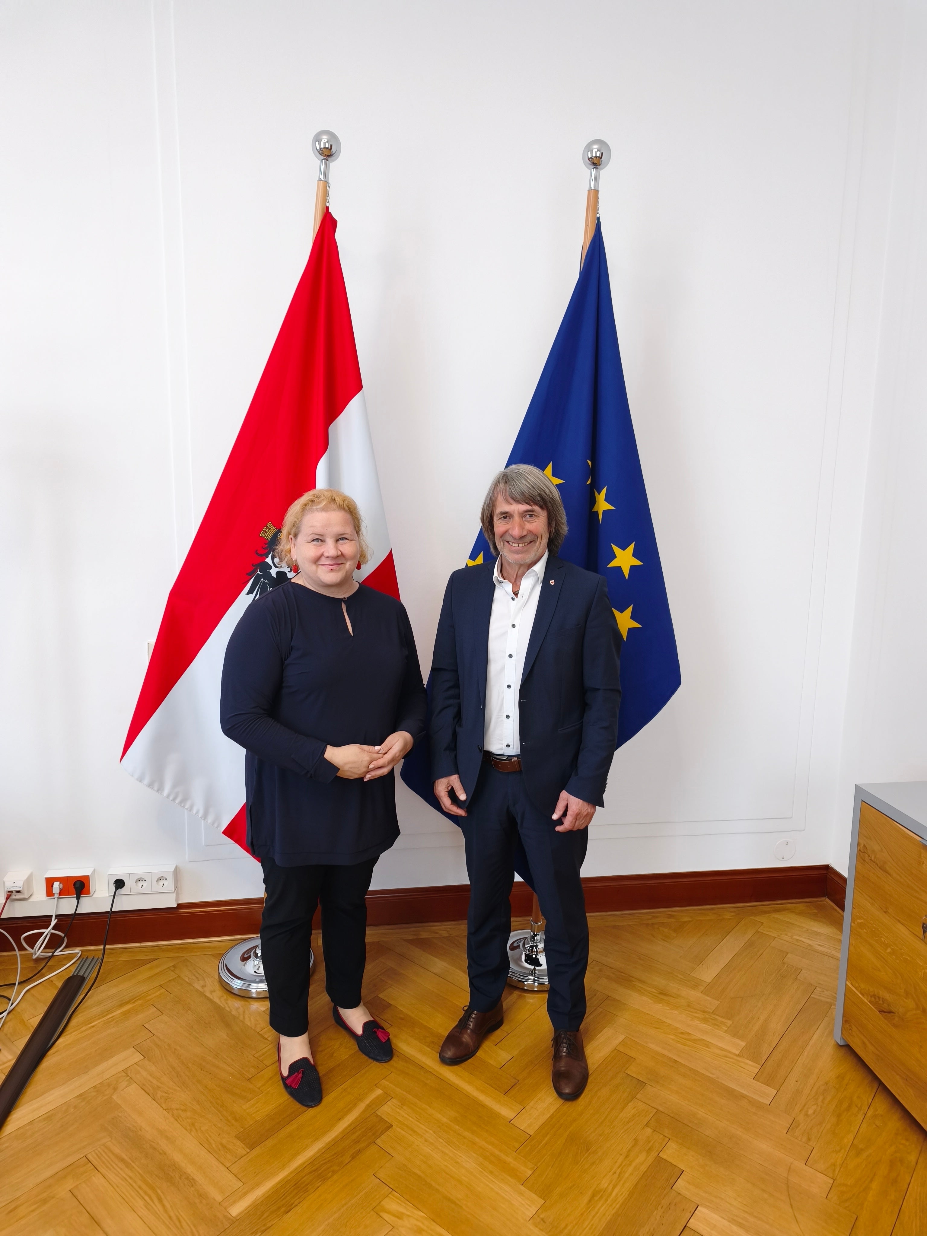 - Il 20 aprile, l'assessore provinciale alla Prevenzione sanitaria e Salute Hubert Messner ha incontrato a Vienna la ministra federale austriaca degli Affari sociali, della Sanità, dell'Assistenza e della Tutela dei consumatori Korinna Schumann. (Foto: USP/Dipartimento Prevenzione sanitaria e Salute) » [IMG 2 MB]